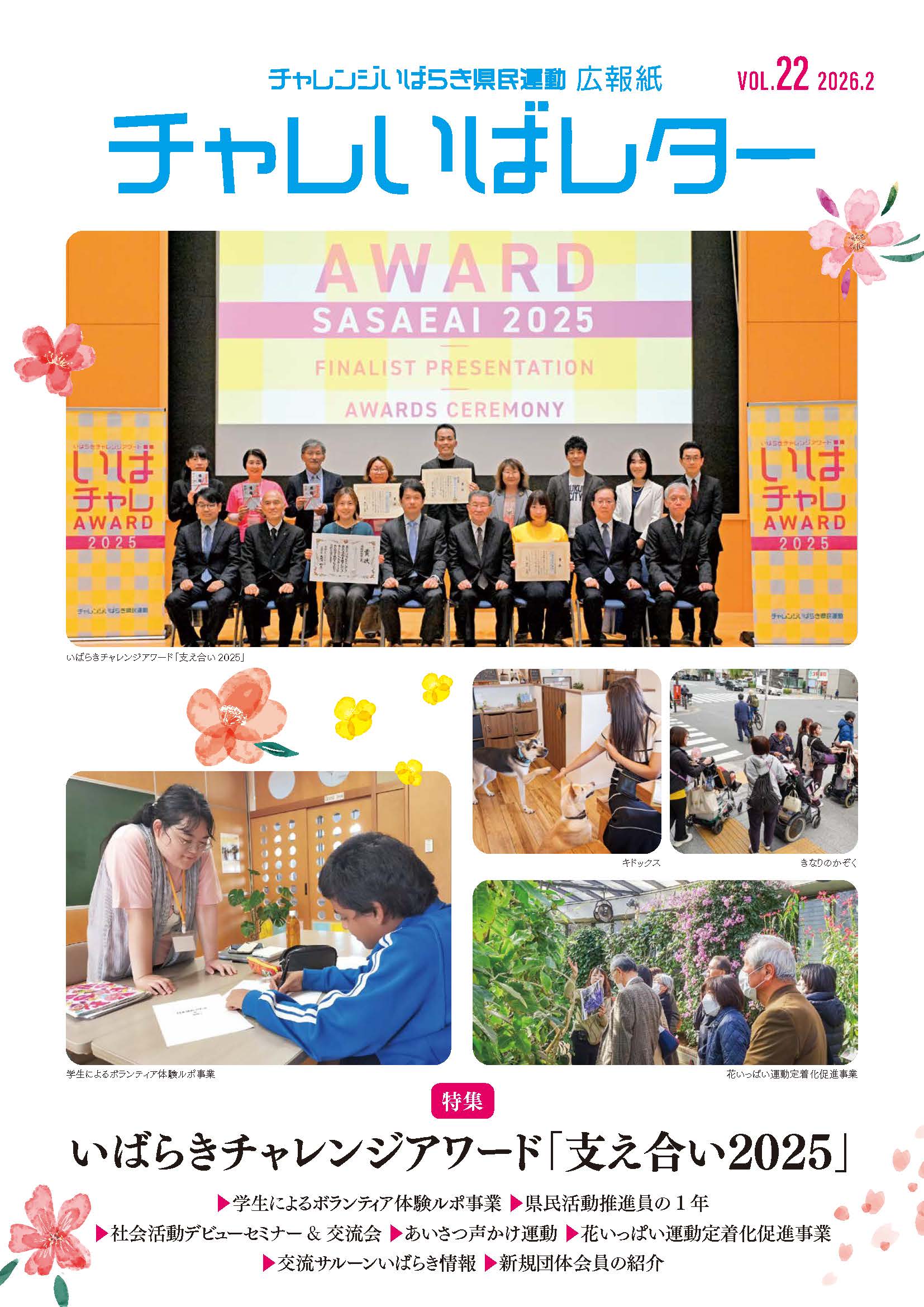 top_img_020いばらきチャレンジアワード top_img_040社会活動デビューセミナー top_img_050交流サルーンいばらき 新着情報 全て お知らせ 主な事業 交流サルーン ネットワーカー 2026/01/28 information|チャレいばメールマガジン(第49号)を配信しました 2026/01/27 report|チャレいばレタープラス✨ 2026/01/22 information|地域活動情報ページを更新しました 2026/01/04 information|新年のご挨拶 一覧を見る 2026/01/28 information|チャレいばメールマガジン(第49号)を配信しました 2026/01/22 information|地域活動情報ページを更新しました 2026/01/04 information|新年のご挨拶 2025/12/26 information|年末年始の休業・休館について 一覧を見る 2025/11/28 information|「いばらきチャレンジアワード『支え合い 2025』」受賞者決定! 2025/10/28 report|第3回社会活動デビューセミナー&交流会を開催しました(2025/10/25) 2025/10/22 information|第3回社会活動デビューセミナー当日の駐車場について(2025/10/25) 2025/10/14 information|学生によるボランティア体験ルポ事業≪R7’冬季募集≫のご案内 一覧を見る 2026/01/04 information|新年のご挨拶 2025/12/26 information|年末年始の休業・休館について 2025/11/19 event|「安心の輪を広げよう!地域活動団体のためのAED&防災講座」開催案内 2025/10/29 information|交流サルーンいばらき臨時休館のお知らせ(2026/1~2月) 一覧を見る 2025/04/14 令和7年度「あいさつ・声かけ運動」「大人のマナーアップ運動―大人が変われば、 子どもも変わる―」街頭キャンペーンを実施しました(2025/0・・・ 2025/04/14 令和7年度チャレンジいばらき県民運動啓発品の支給申請について 2024/11/14 report|令和6年度「あいさつ・声かけ運動」「大人のマナーアップ運動―大人が 変われば、子どもも変わる―」強調月間街頭キャンペーンに参加・・・ 2024/04/01 report|令和6年度 ネットワーカー活動紹介 (2024/10/01更新) 一覧を見る チャレいば動画vol21 はぐっど メッセージ動画 チャレいば動画vol21 ハレとケ 活動動画 チャレいば動画vol20 認定NPO法人キドックス チャレいばレターVOL.19 【特集】NPO法人ユアフィールドつくば チャレいばレターVOL.19 【特集】NPO法人ただいま チャレいばレターVOL.18【特集】折橋地域活性化プロジェクトチーム イベントカレンダー チャレンジいばらき県民運動・交流サルーンいばらきが開催するイベント・講座、相談会などが確認いただけます。 助成金 イベント・講座 ボランティア・寄付 情報を投稿する 地域活動団体データベース メールマガジン登録(無料) 広報紙「チャレいばレター」 第22号(2026年2月発行) 第21号(2025年10月発行) 第20号(2025年7月発行) 第19号(2025年3月発行) 一覧を見る BLOG 2026/01/27 report|チャレいばレタープラス✨ 2025/12/12 report|令和7年度 花いっぱい運動定着化促進事業 『認定証交付式』を開催しました(2025/12/10) 2025/12/11 report|第4回社会活動デビューセミナー&交流会を開催しました(2025/12/06) 2025/11/14 report|令和7年度「あいさつ・声かけ運動」「大人のマナーアップ運動―大人が 変われば、子どもも変わる―」強調月間街頭キャンペーン(水戸・・・ 2025/11/14 report|令和7年度「あいさつ・声かけ運動」「大人のマナーアップ運動―大人が 変われば、子どもも変わる―」強調月間街頭キャンペーン(土浦・・・ 一覧を見る SNS Facebook X youtube