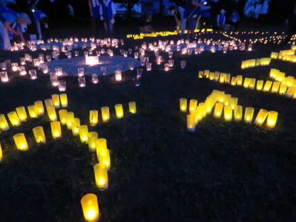 近年発生している災害の犠牲者への追悼と家族や地域の絆への思いをこめて、ひまわり型にならべた約500個のキャンドルに灯りをともしました。