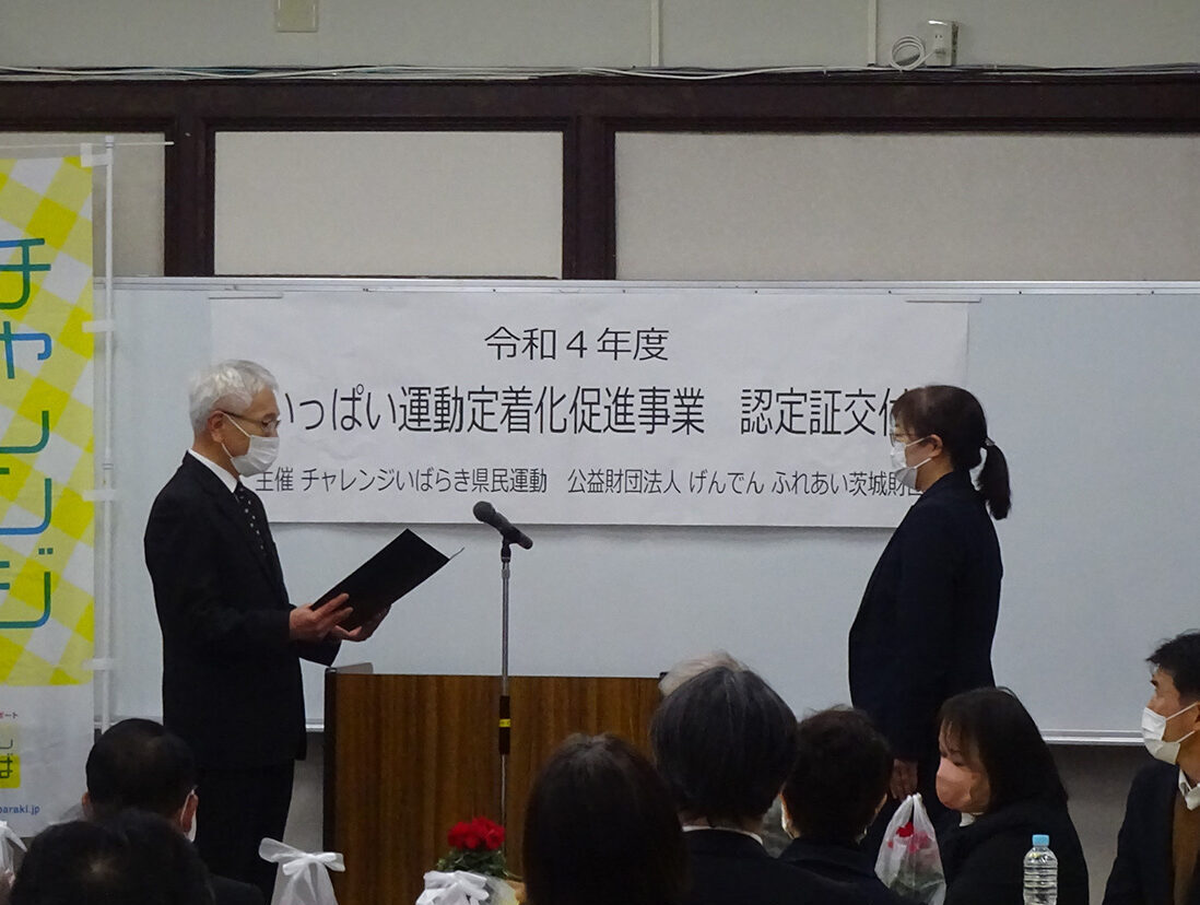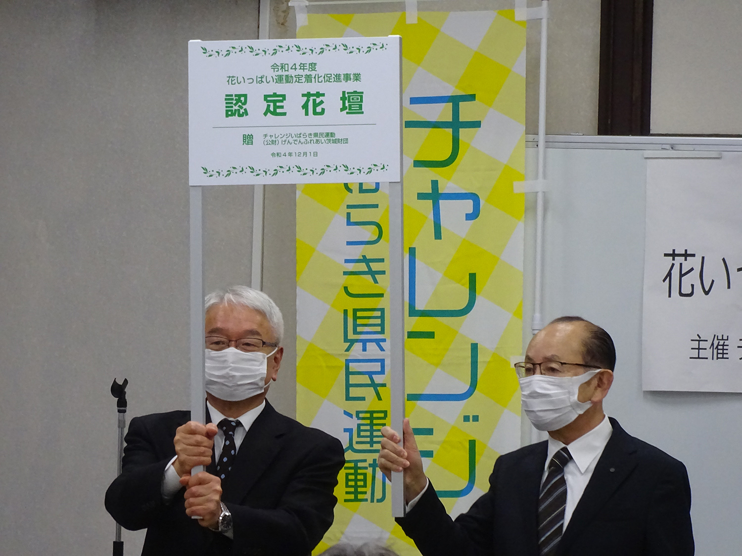 認定証交付式では、今年度応募のあった43の団体・学校から認定された24の団体・学校に対し、チャレンジいばらき県民運動 理事長 阿部真也と公益財団法人 げんでんふれあい茨城財団 専務理事 髙橋鉄夫より認定証を交付するとともに、目録及び花壇に設置する看板を贈呈いたしました。