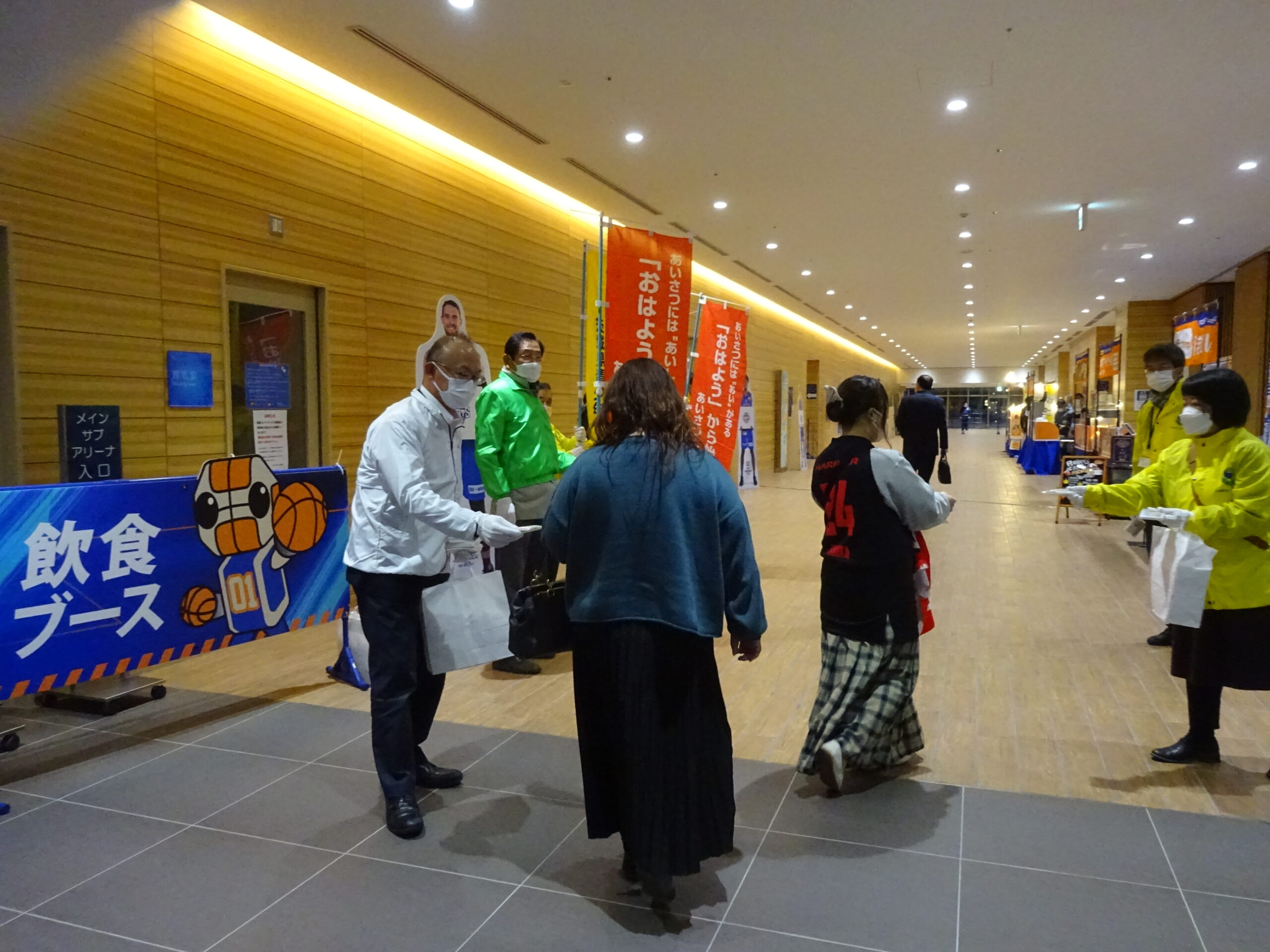 キャンペーン当日は、1階正面階段の横のモニターでキャンペーンをPRしながら、両チームのサポーターの皆さんに啓発品の「ポケットティッシュ」を配布をしました。当日は、マスク着用等、新型コロナウイルス感染防止対策を講じて実施しました。