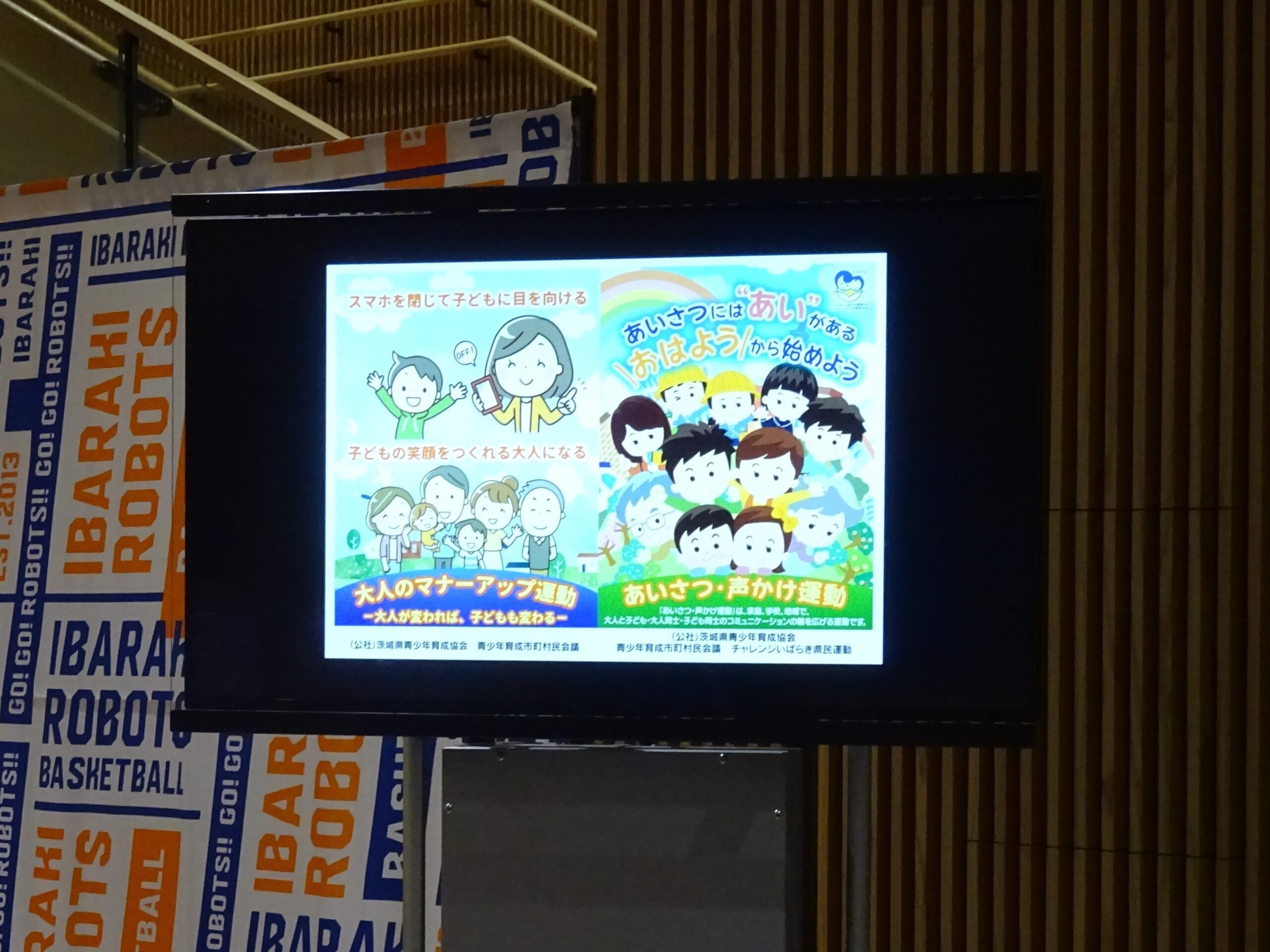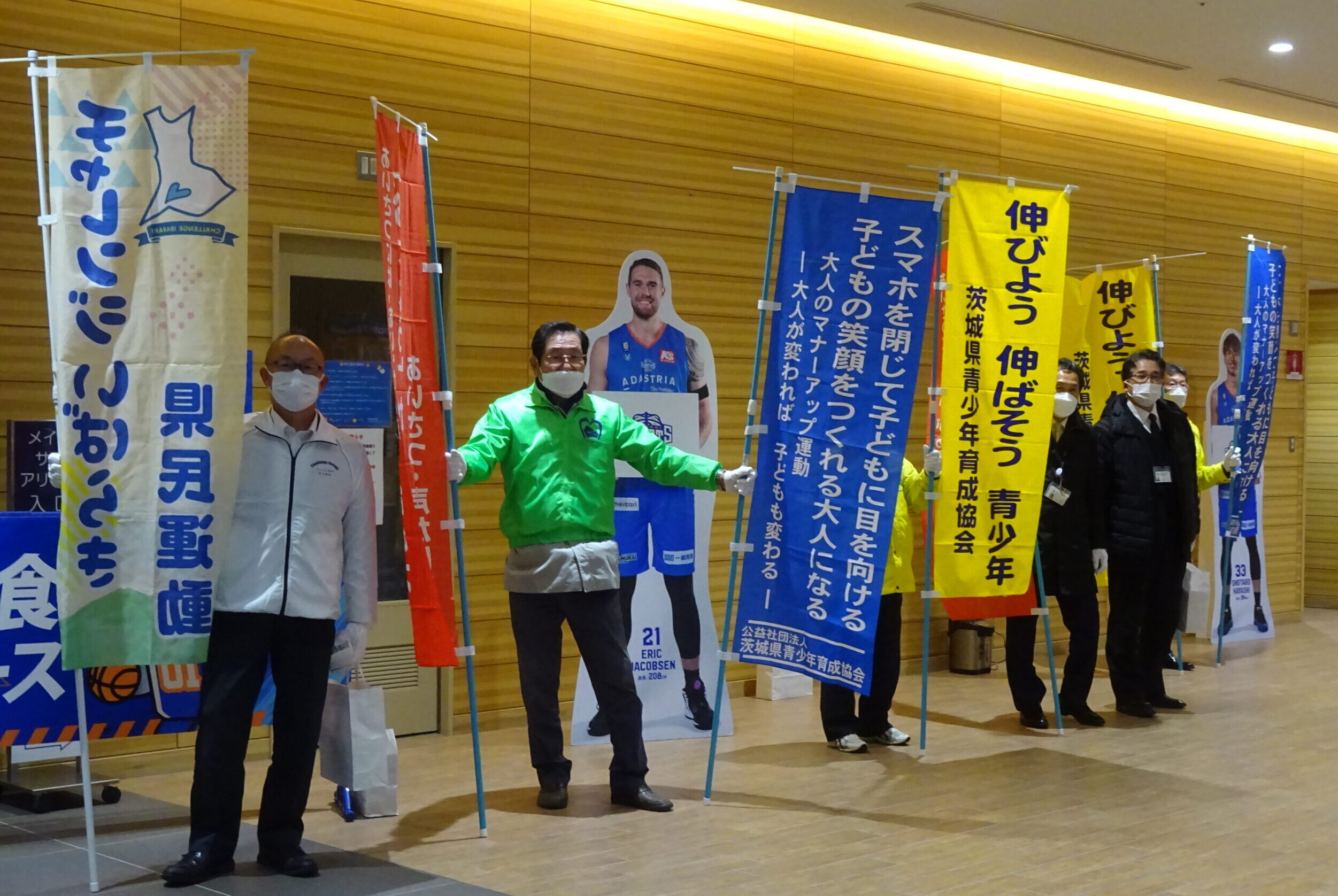 12/14(水)水戸市のアダストリアみとアリーナで開催された茨城ロボッツ対アルバルク東京の試合において、主催者の(公社)茨城県青少年育成協会、水戸市青少年育成推進会議と「あいさつ声かけ運動」街頭キャンペーンを実施しました。