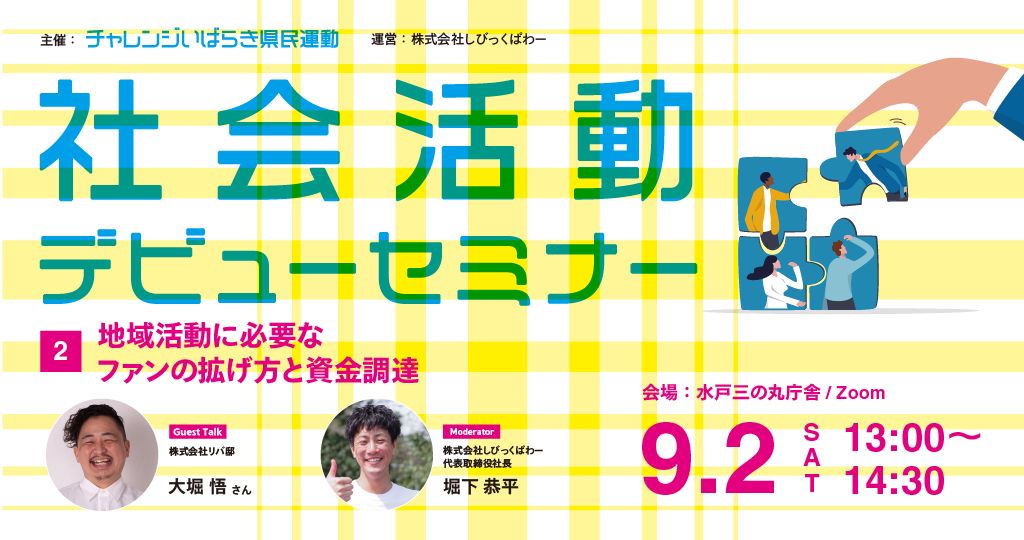 茨城県内で地域の困りごと解決やコミュニティづくりなど、社会の新しい力になってみたいと考えている方に向けて『社会活動デビューセミナー』を開催します📣全国で地域に根ざした活動をしている方から、事例や手法を学びます。社会活動の「はじめの一歩」から仲間づくりまで、あなたのチャレンジを応援します!