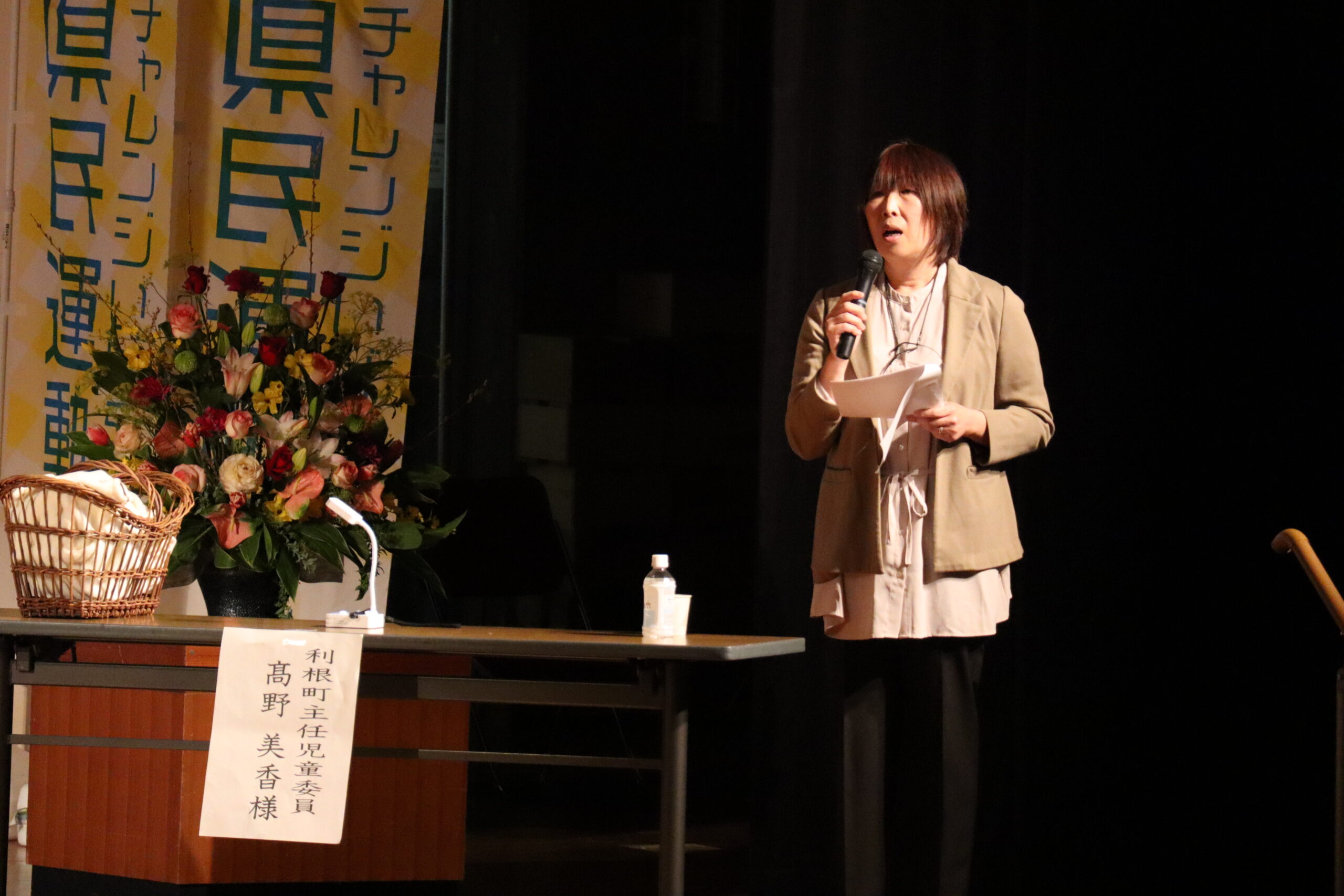 講演では、利根町の主任児童委員を務める高野 美香 さんにご登壇いただき、日ごろ接している親子へのかかわりから感じていること、現代の子どもたちを取り巻く環境などから「虐待防止のために地域ができること」についてご講演をいただきました。