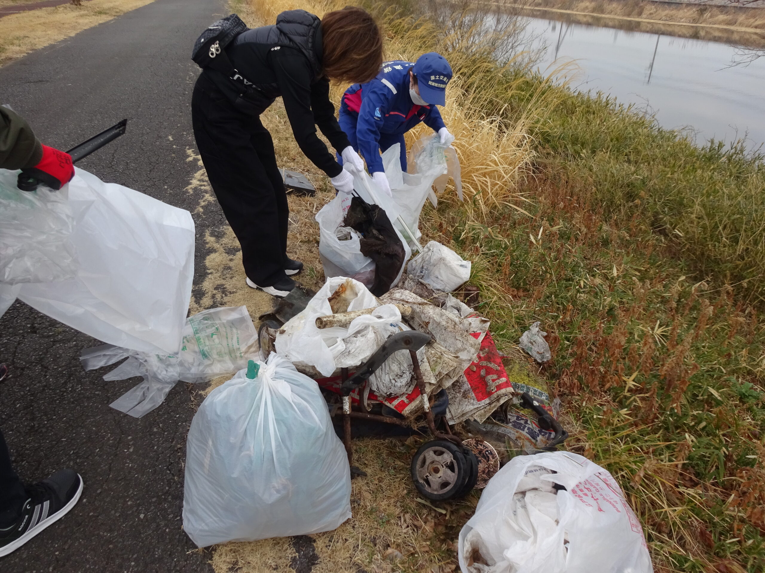 新利根川周辺の川岸の歩道には、たばこの吸い殻など、目につきにくい小さなゴミが多く落ちており、川岸近くの目立たない場所には、生活に身近な物品が投棄されていました。