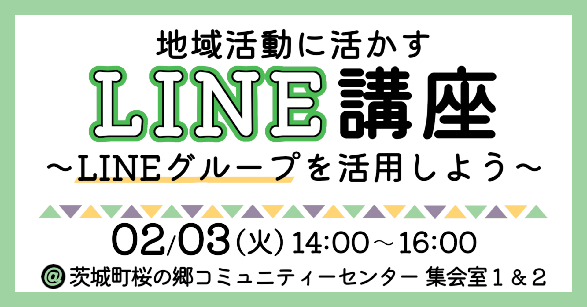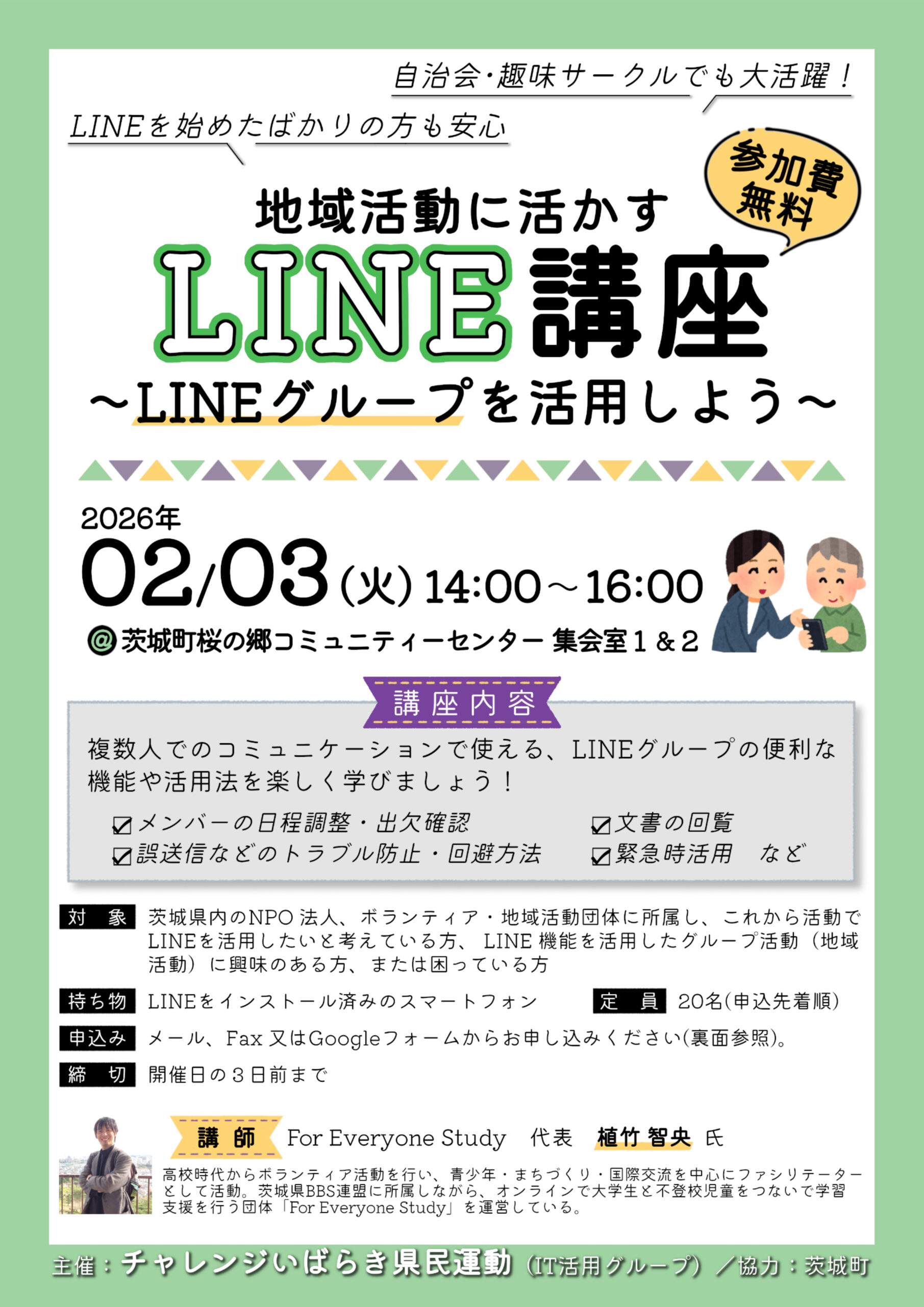 ボランティア活動や自治会活動などの地域活動はもちろん、家族・友人との日常でも使える便利なLINE機能を、楽しく学べる講座です!