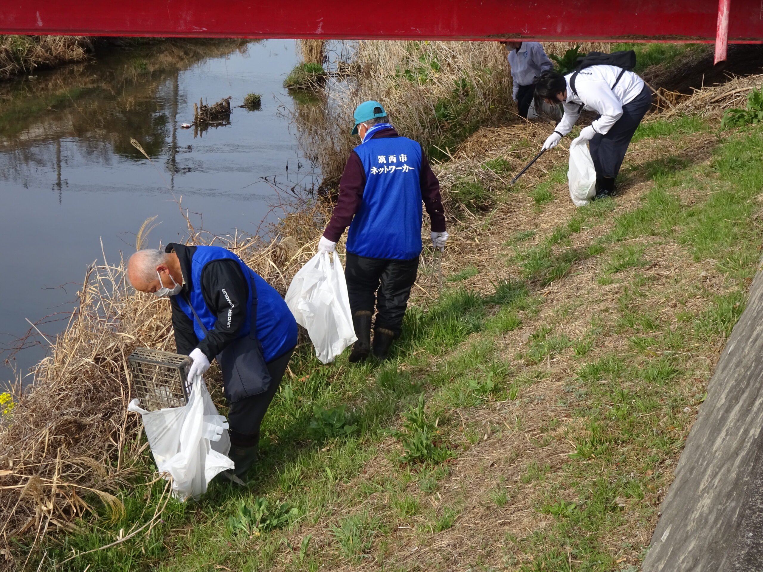 桜川沿いの歩道の草陰には、たばこの吸い殻や使用済のビニール袋など生活身に近なゴミが、川岸近くの目立たない場所には、肥料袋や苗トレーなどが投棄されており、参加者同士が協力し、数多くのゴミを回収しました。