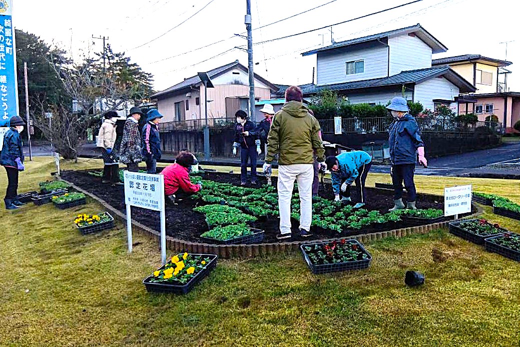 地域の景観向上と住民の癒しを願い、町内10箇所の花壇に色とりどりのパンジーを植えました。