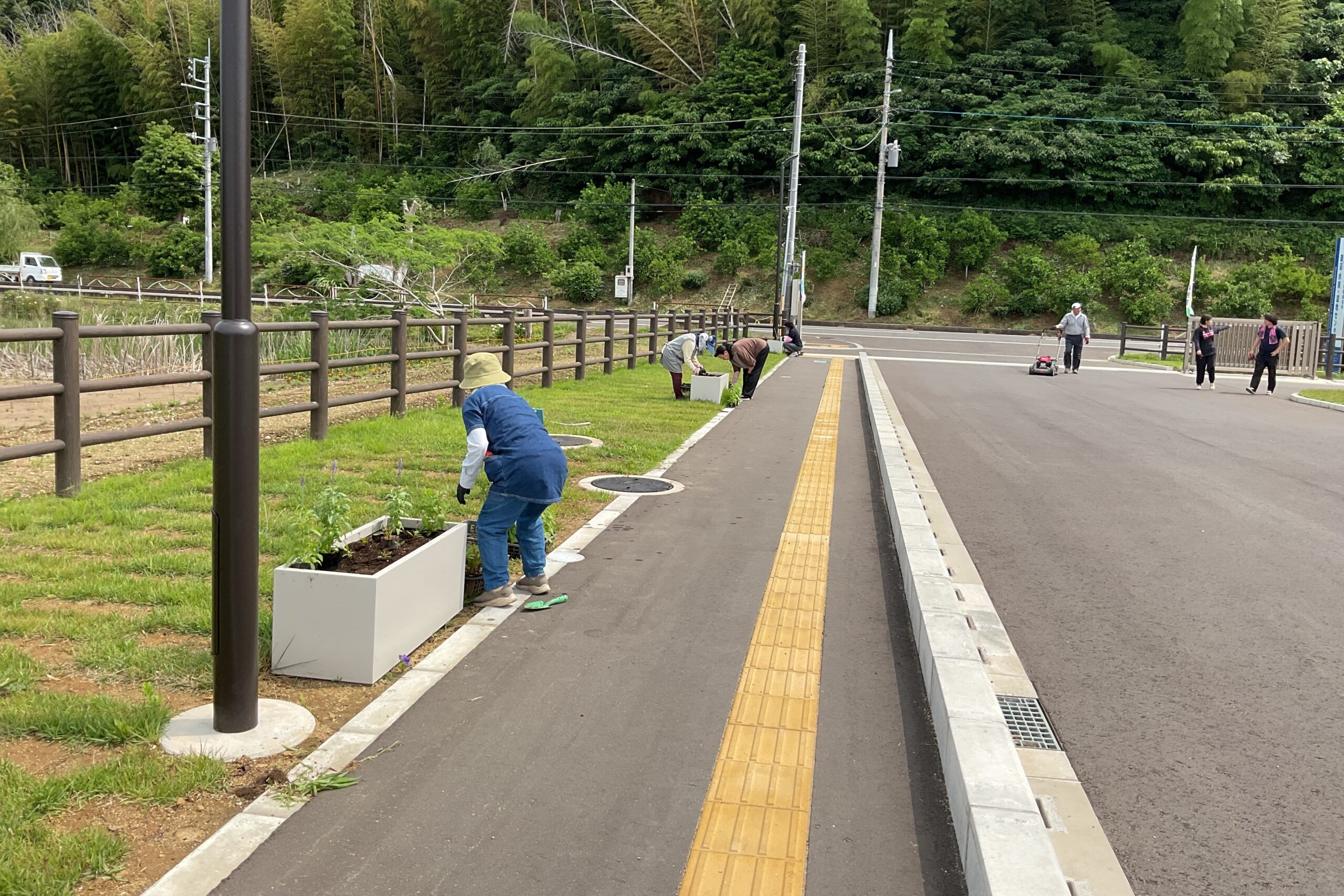 施設敷地内のプランターの植え替えや周辺のゴミ拾い、遊歩道周辺の草刈りなどを行いました。