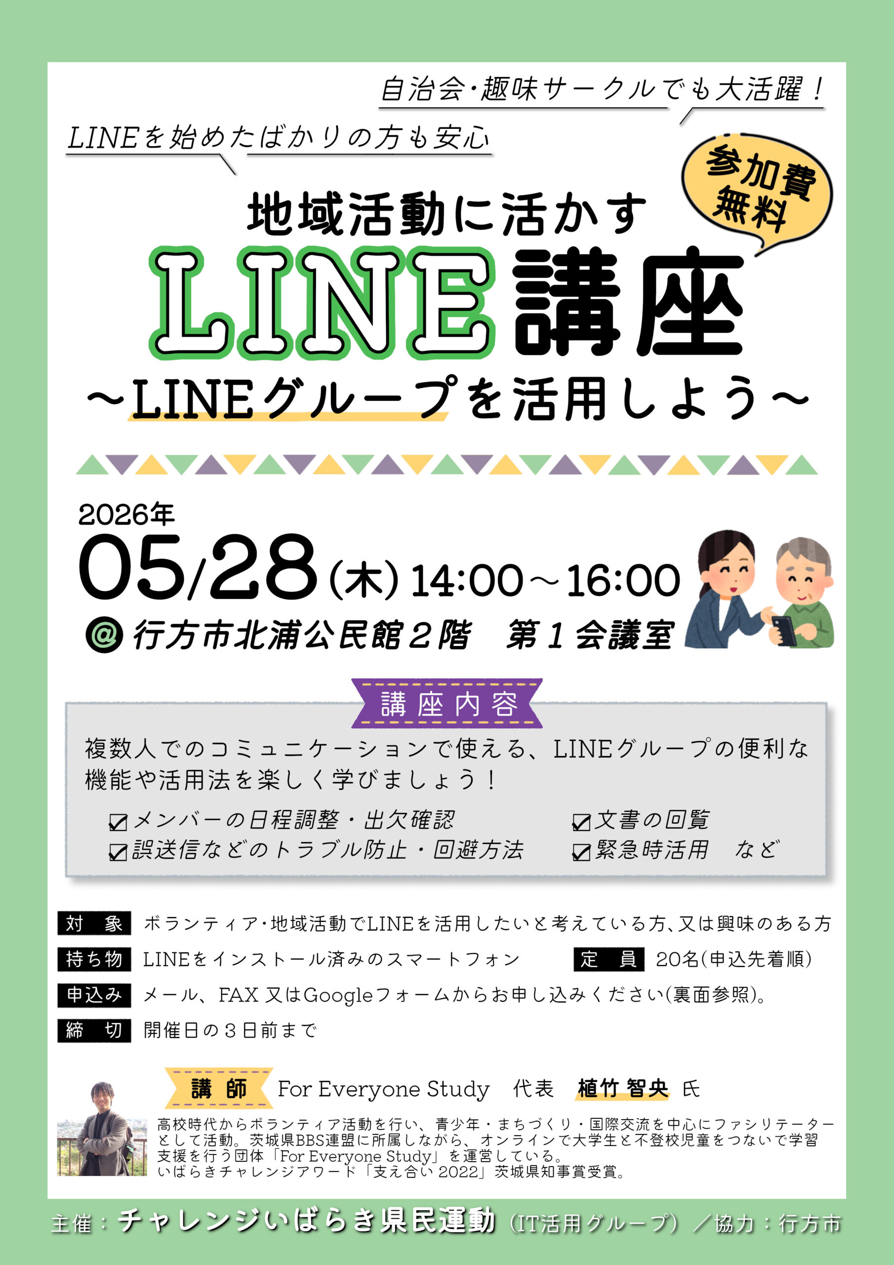 ボランティア活動や自治会活動などの地域活動はもちろん、家族・友人との日常でも使える便利なLINE機能を、楽しく学べる講座です!
