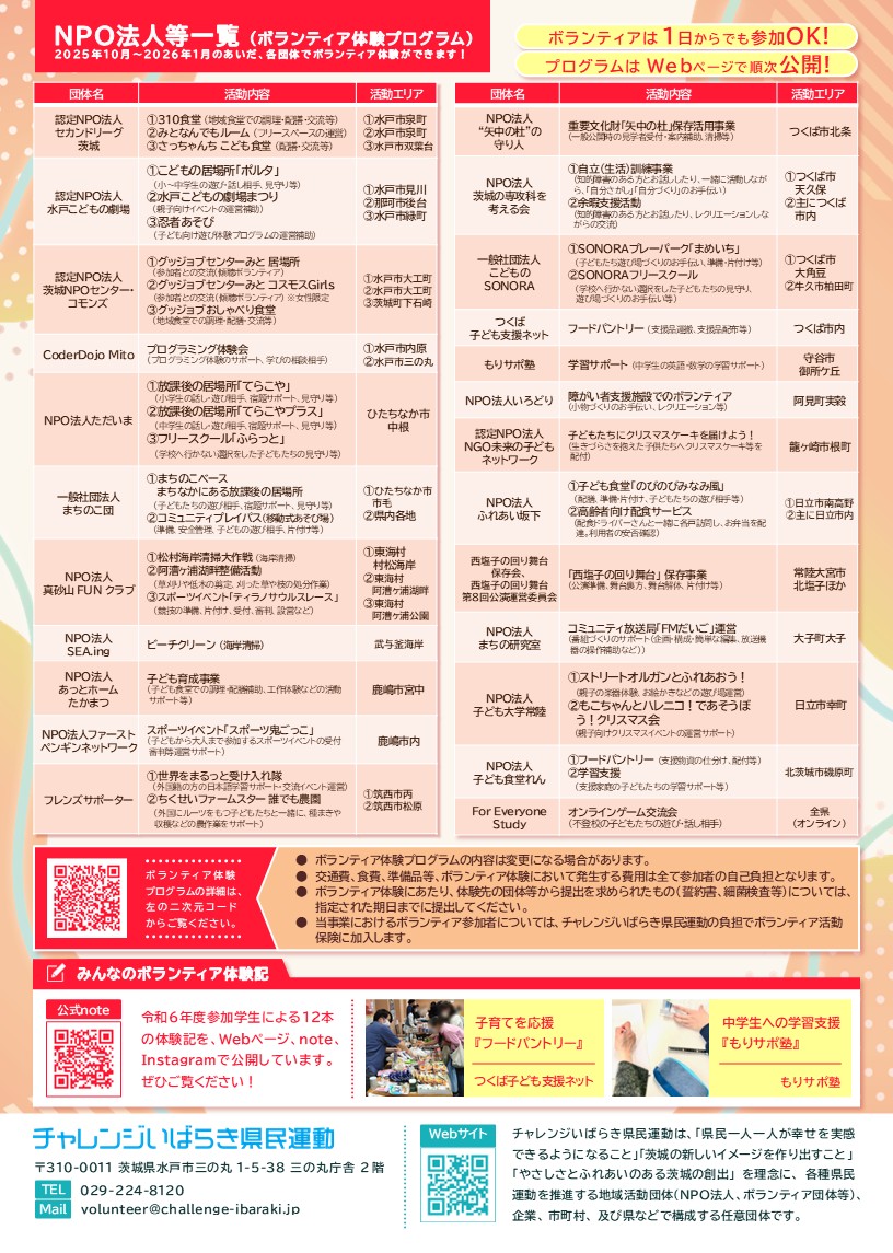 ※「NPO法人等一覧」(ボランティア体験プログラム一覧) は、期間中随時更新されます。
