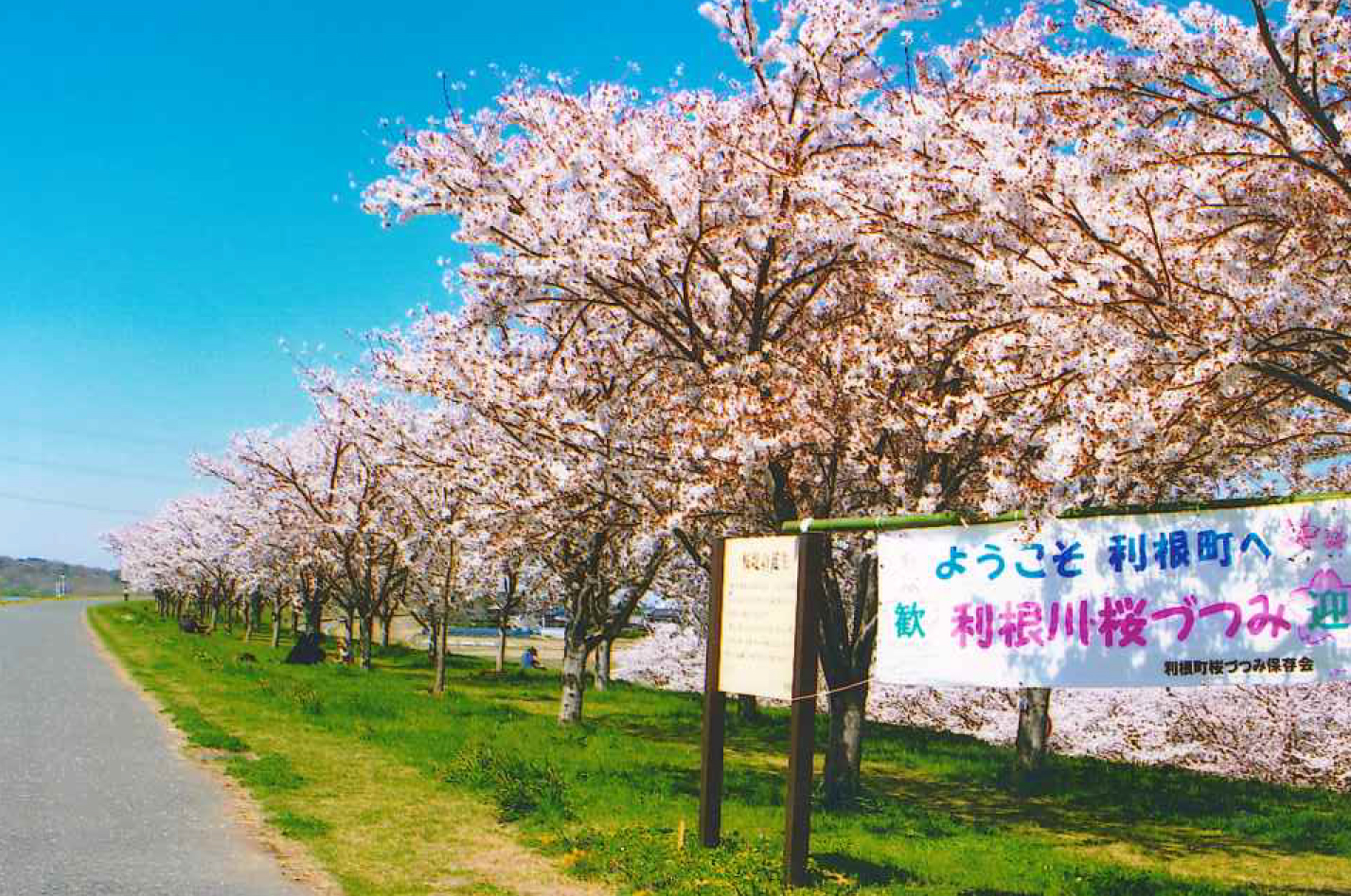 田と緑に親しみ、人と触れ合う憩いの場所作りに平成13年3月にオーナー制度を活用し、利根川堤に182本の桜を植樹。桜の開花時期には桜トンネルを潜る楽しみや写真撮影に県内外から多くの皆様が訪れ、心を繋ぐ場として利用されています。
