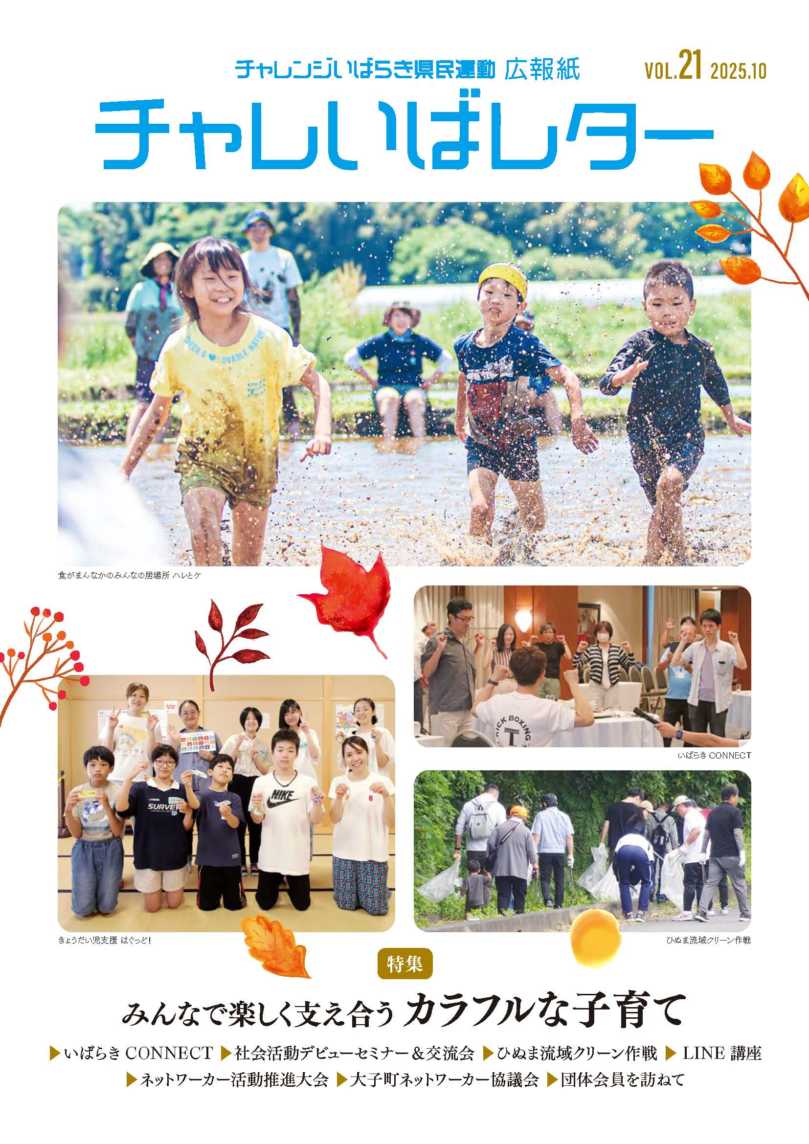 トップページ > 広報紙「チャレいばレター」 Tweet 広報紙「チャレいばレター」 ▶ 広報紙「チャレいばレター」VOL.19の記事訂正のお知らせ 第20号(2025年7月発行) «特集»サステナブルな地域活動を応援します‼ ・総会実施報告 ・ネットワーカー活動推進大会 ・ネットワーカー活動紹介 ・県民活動推進員会議 ・団体会員を訪ねて ・花いっぱい運動定着化促進事業 ・交流サルーンいばらき情報 第19号(2025年3月発行) «特集»いばらきチャレンジアワード「支え合い2024」ファイナリストプレゼンテーション・表彰式 ・学生によるボランティア体験ルポ事業 ・社会活動デビューセミナー ・私のボランティアtalk&matching ・花いっぱい運動定着化促進事業 ・LINE講座 ・あいさつ声かけ運動 ・寺子屋サルーン 第18号(2024年11月発行) «特集»地域で頑張るシニアヒーロー ・社会活動デビューセミナー ・私のボランティアtalk&matching事業 ・団体会員を訪ねて ・茨城県生活学校連絡会×専門学校文化デザイナー学院 ・ネットワーカー等連絡協議会代表者会議 ・ネットワーカー活動紹介 第17号(2024年7月発行) «特集»地域に新しい風を~居心地のよい居場所づくりのヒント~ ・総合実施報告 ・県民活動推進員会議 ・団体会員を訪ねて ・ネットワーカー活動紹介 ・ネットワーカー活動推進大会 第16号(2024年3月発行) «特集»いばらきチャレンジアワード「支え合い2023」 「茨城県知事賞」受賞団体の活動紹介 ・いばらきチャレンジアワード「支え合い2023」 ・私のボランティアtalk&matching事業 ・茨城県企業連携型NPO活動支援事業 ・団体会員を訪ねて ・花いっぱい運動定着化促進事業 ・県民運動を地域で支える地域活動員(ネットワーカー)の活動紹介 ・寺子屋サルーン ・あいさつ・声かけ運動 第15号(2023年11月発行) «特集»応援しよう!若い世代のボランティア活動 ・ネットワーカー等連絡協議会代表者会議 ・私のボランティアtalk&matching事業 ・社会活動デビュー支援事業 ・団体会員を訪ねて ・ひぬま流域クリーン作戦 ・寺子屋サルーン ・県民運動を地域で支える地域活動員(ネットワーカー)の活動紹介 第14号(2023年7月発行) «特集»歩み寄りのコミュニケーション〜学び合って、始めよう、ゼロからのボランティア〜 ・総会実施報告 ・県民活動推進員会議 ・私のボランティアtalk&matching事業 ・茨城県企業連携型NPO活動支援事業 ・団体会員を訪ねて ・ネットワーカー活動推進大会 ・茨城県生活学校連絡会 総会 ・霞ヶ浦・北浦地域清掃大作戦 第13号(2023年3月発行) いばらきチャレンジアワード「支え合い2022」ファイナリストプレゼンテーション・表彰式 «特集»地域で育てる未来の宝 ・花いっぱい運動定着化促進事業 認定証交付式 ・社会活動デビューセミナー ・ネットワーカーの活動紹介 ・団体会員を訪ねてVOL.4 ・茨城県企業連携型NPO活動支援事業 第12号(2022年11月発行) «特集»「異世代による交流」が「地域のつながり」を強めます。世代を超えてつながろう! ・チャレンジいばらき県民運動の事業実施報告 ・社会活動デビュー支援事業 ・団体会員を訪ねて ・ネットワーカーの活動紹介 ・いばらきチャレンジアワード「支え合い2022」ファイナリスト プレゼンテーション・表彰式観覧のお知らせ 第11号(2022年7月発行) «特集»あなたの「生きがいづくり」が、地域の「幸せ力アップ」に!社会貢献活動をはじめよう! ・チャレンジいばらき県民運動の活動紹介 ・提案型共助社会づくり支援事業 ・社会活動デビュー支援事業 ・団体会員を訪ねて ・[募集]いばらきチャレンジアワード「支え合い2022」 第10号(2022年3月発行) «特集»新しいコミュニティづくり ・花いっぱい運動定着化促進事業 認定交付式 ・あいさつ・声かけ運動 ・コミュニティワーク実践講座 ・NPO法人設立説明会 ・提案型共助社会づくり支援事業 ・地域円卓会議 in 茨城2022 ・団体会員を訪ねて Vol.1《鈴縫工業株式会社》 ・新規会員紹介・入会のご案内 ・チャレいば助け合い隊応援事業 ・地域活動員〔ネットワーカー〕の活動紹介 ・寺子屋サルーン「オンラインサロンづくりの第一歩」 ・メルマガ登録案内 第9号(2021年11月発行) «特集»利用してみませんか?助け合いの 「足」で繋がる地域の輪と便利な暮らし ・理事長就任のごあいさつ ・チャレンジいばらき県民活動推進員会議 ・令和3年度 ネットワーカー等連絡協議会代表者会議 ・提案型共助社会づくり支援事業 ・地域活動員(ネットワーカー)の活動紹介 ・寺子屋サルーン「オンラインサロンづくりの第一歩」 ・ホームページリニューアルのご案内 ・「女性に対する暴力をなくす運動」期間です ・パープルライトアップ実施のご案内 第8号(2021年7月発行) «特集»エコチャレンジ2021 涼しく過ごそう 今年の夏も!!未来の夏も!! ・令和3年度 チャレンジいばらき県民運動 ・地域活動員(ネットワーカー)の 活動紹介 ・提案型 共助社会づくり支援事業 ・地域円卓会議 in 茨城2021 ・交流サルーンいばらきの紹介 ・花いっぱい運動定着化促進事業 ・STOP!コロナ